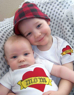 How about a Mom Heart Tattoo Applique. Because these two little guys are so rough and tough....alright, not so much, but they sure are lovable. When Clark and I started our photo shoot I asked him to act tough, all I got were smiles and kisses (maybe he was remembering our Christmas shirt shoot).