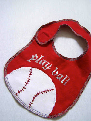 Once you have your bib pieces cut out, you'll want to applique or embellish them to your liking. All of my bibs have a bit of applique and freezer paper stenciling on them. The football and baseball also have some simple embroidery stitches. My post from yesterday has some helpful tips on applique.