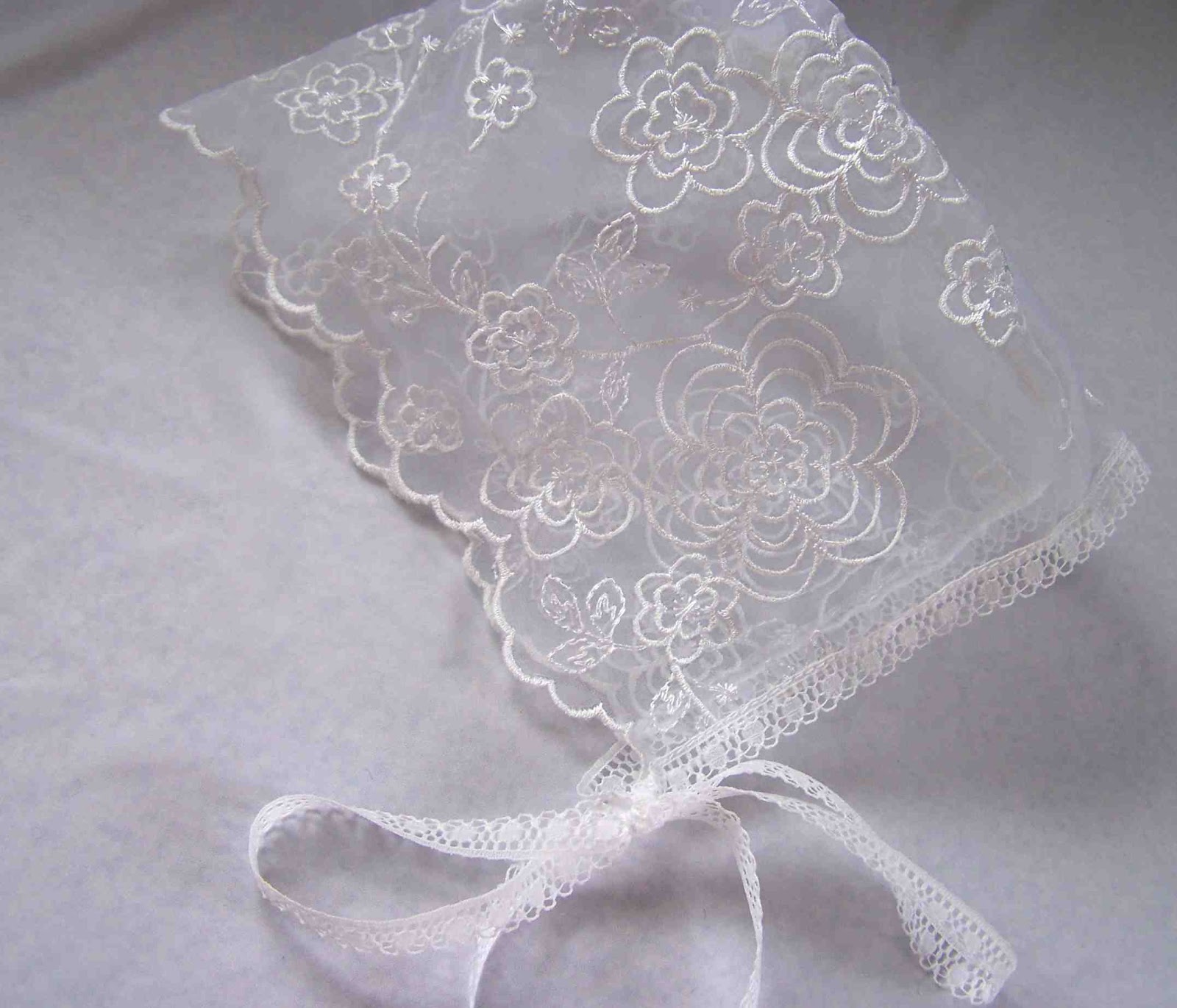 I picked up a remnant piece of fabric a couple of years ago. I was sure that it was going to turn into something lately. Unfortunately, when I got it home, I realized that it was embroidered on one end, and that the majority of the fabric was simply sheer with small flowers every six inches or so. The scalloped edge ran along the side, which was only 18 inches or so. So, it sat, and sat, and sat in my drawer, waiting to be used. It would have been a beautiful overlay for a christening or blessing gown, but like I said there was only 18 inches.